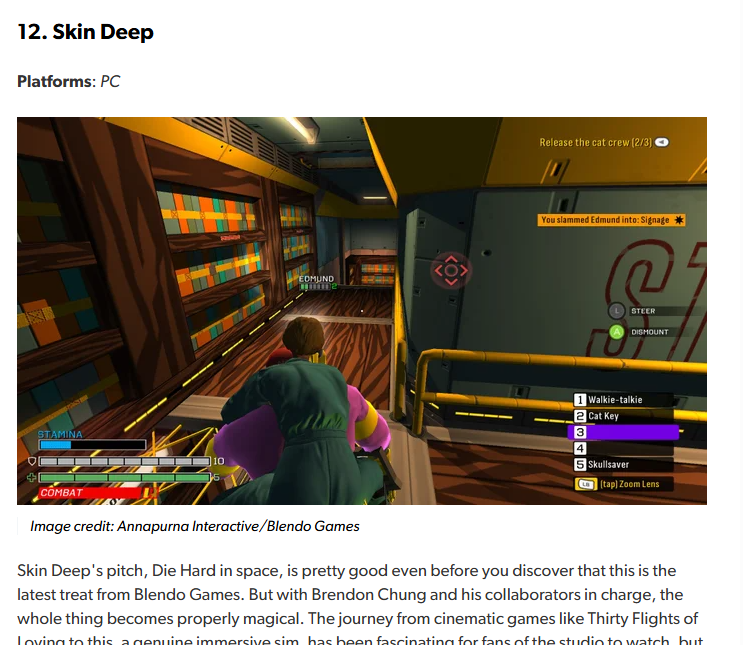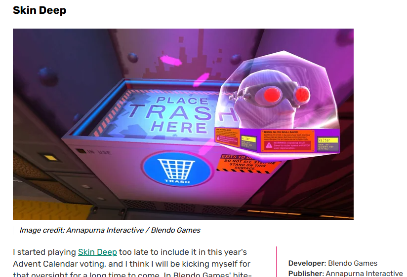 Skin Deep was featured in GamesRadar’s Year In Review 2025, with perhaps my favorite headline ever.
