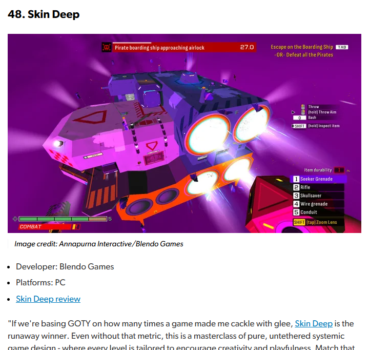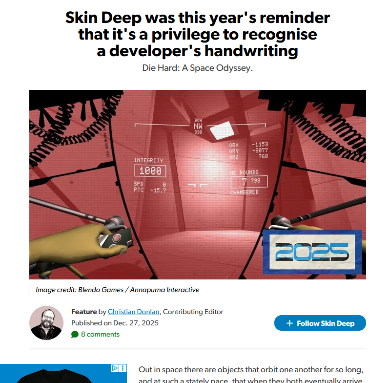 And last but not least, Skin Deep was featured in a very lovely writeup in Eurogamer’s ‘Games of 2025’ roundup.