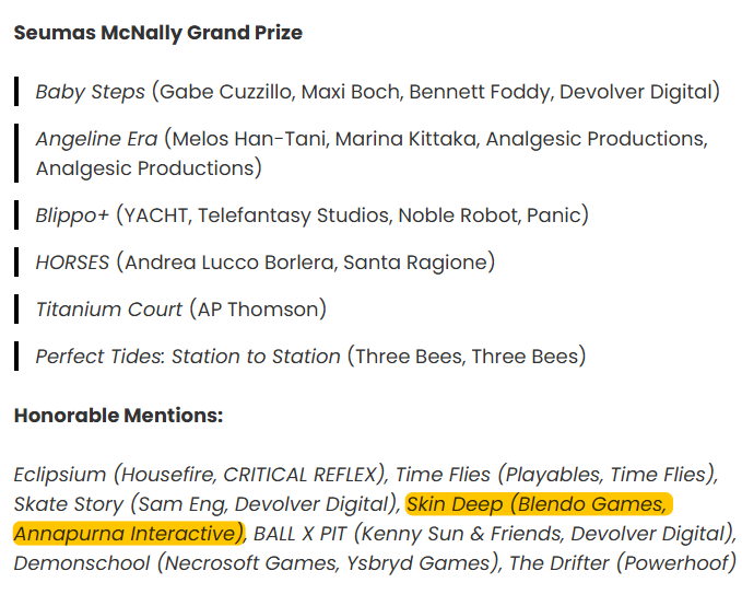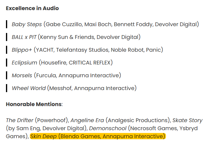 Skin Deep was nominated for the 2026 IGF Excellence in Design award!
