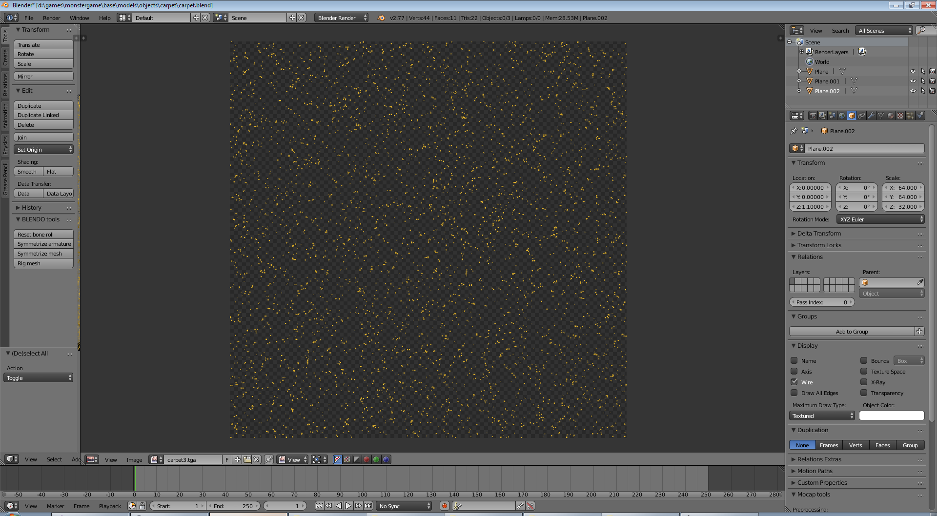 - Dark splotches are overlayed on each texture. This gives the carpet the illusion of having distressed areas, valleys, and matted-down parts.