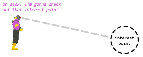 In hindsight, this probably should’ve instead been integrated into the existing Interest Point system. I think I kept separate it in order to simplify the Interest Point system (it’s been a while and I don’t quite remember all the reasons), but that had some trade-offs.