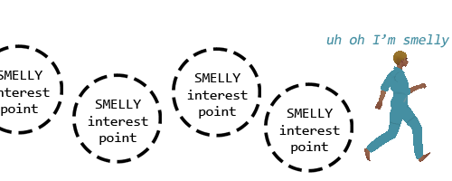 We treat smells as a variant of a sound Interest Point. Like a sound, smells are perceived without needing line of sight, and can permeate walls. This approach was inspired by how Half-life 1 handled smells.