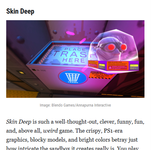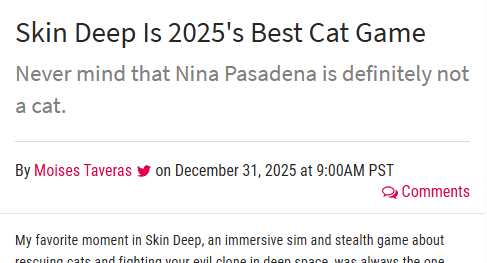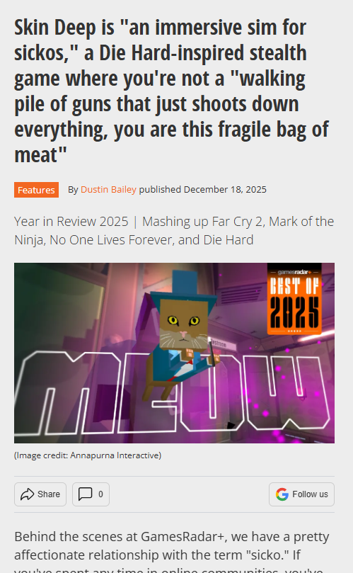 Skin Deep was featured in GamesRadar’s Year In Review 2025, with perhaps my favorite headline ever.