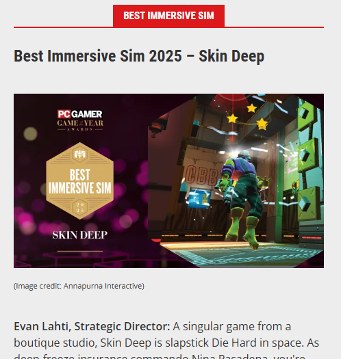 PC Gamer named their Game of the Year Awards, and Skin Deep was their BEST IMMERSIVE SIM OF 2025!