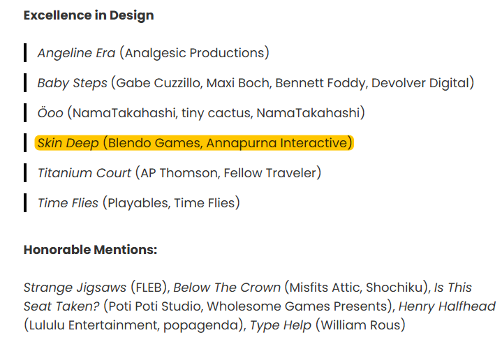 Skin Deep was nominated for the 2026 IGF Excellence in Design award!
