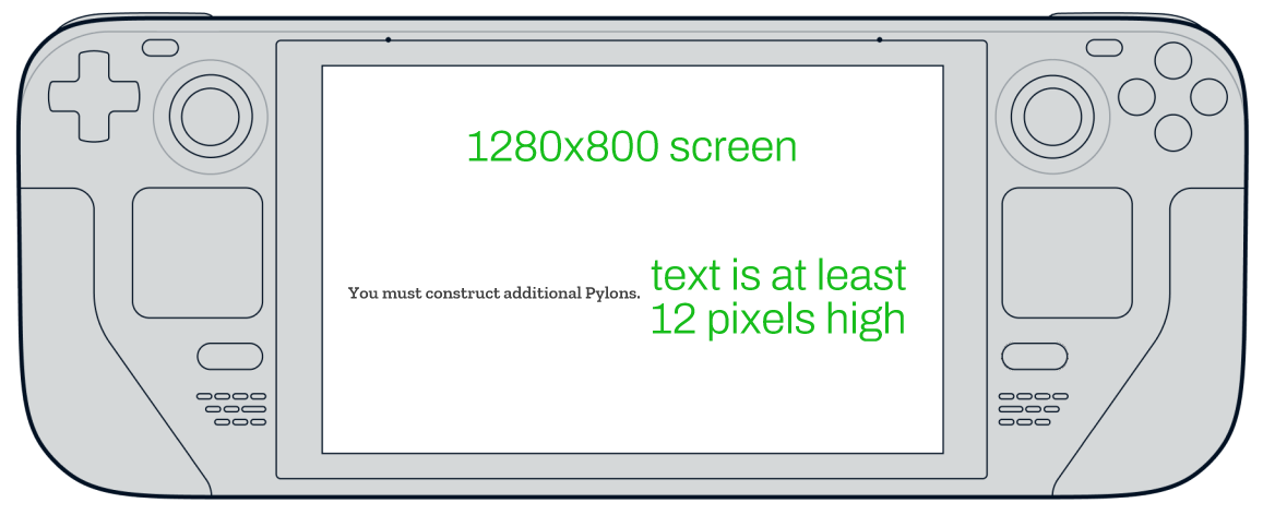The Steam Deck screen resolution is 1280x800 and text should be at least about 12 pixels high.